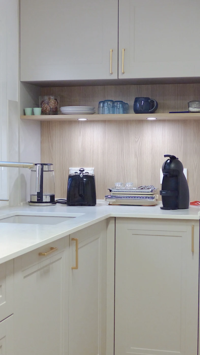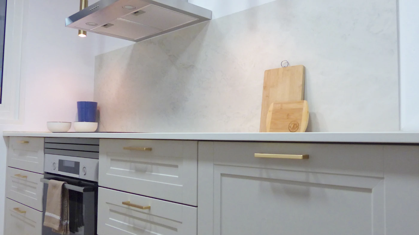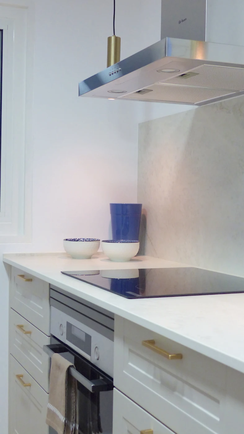 La encimera de Neolith Everest, con su tono cremoso y vetas suaves, aporta luminosidad y una textura natural que realza el conjunto. Los detalles dorados y una esquina de apoyo y desayuno completan el espacio, invitando a disfrutar del día a día con comodidad y estilo.