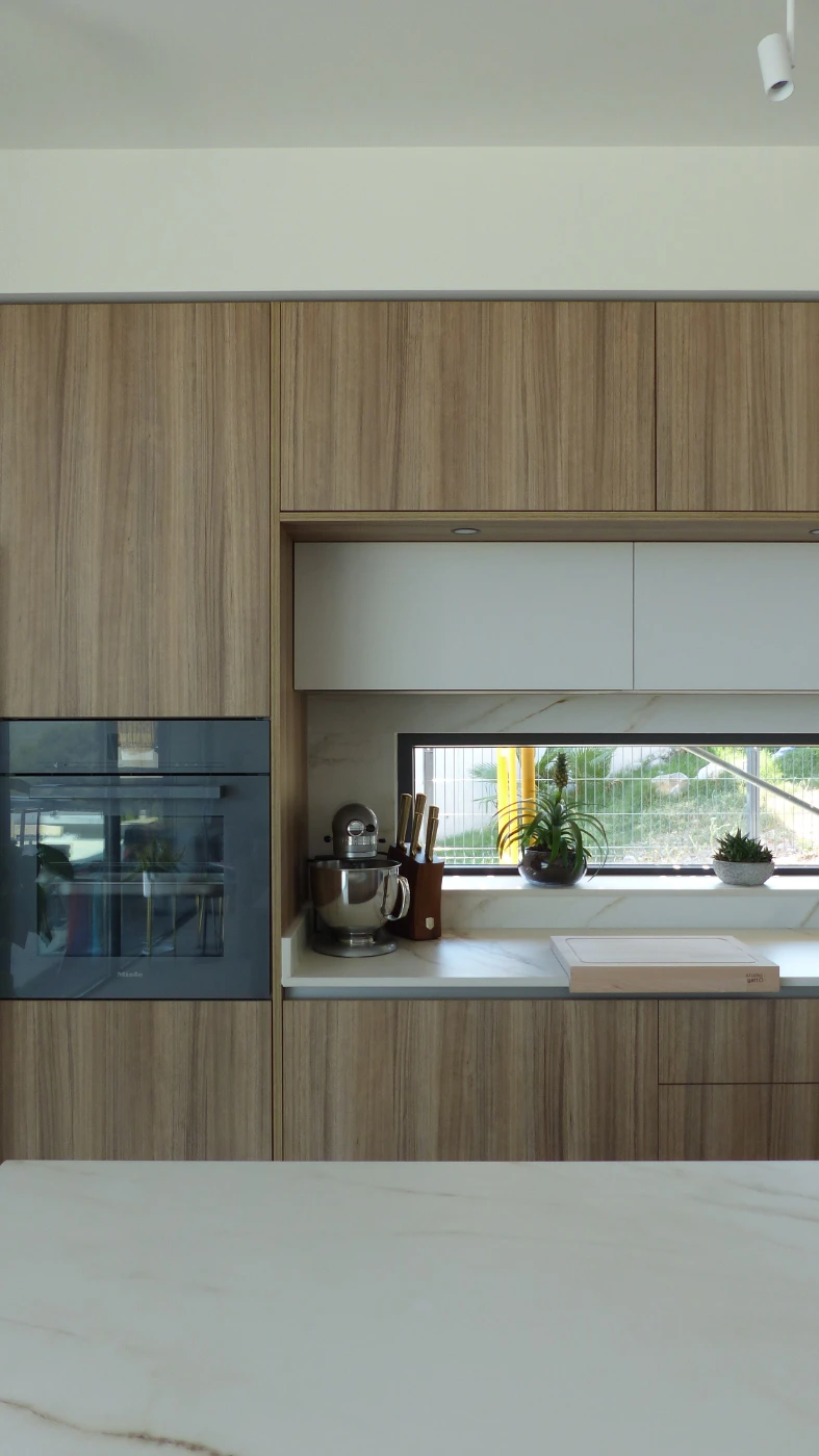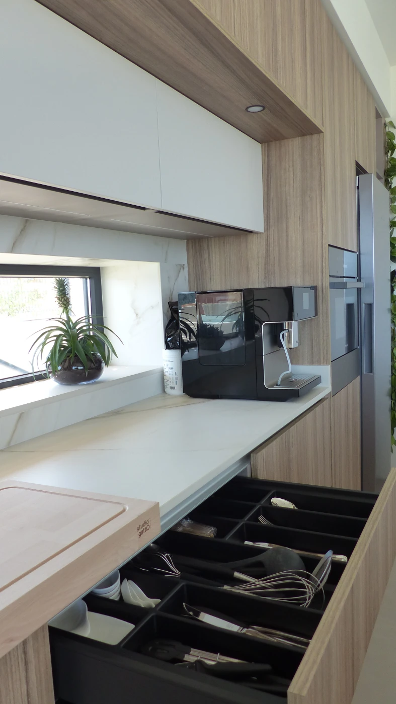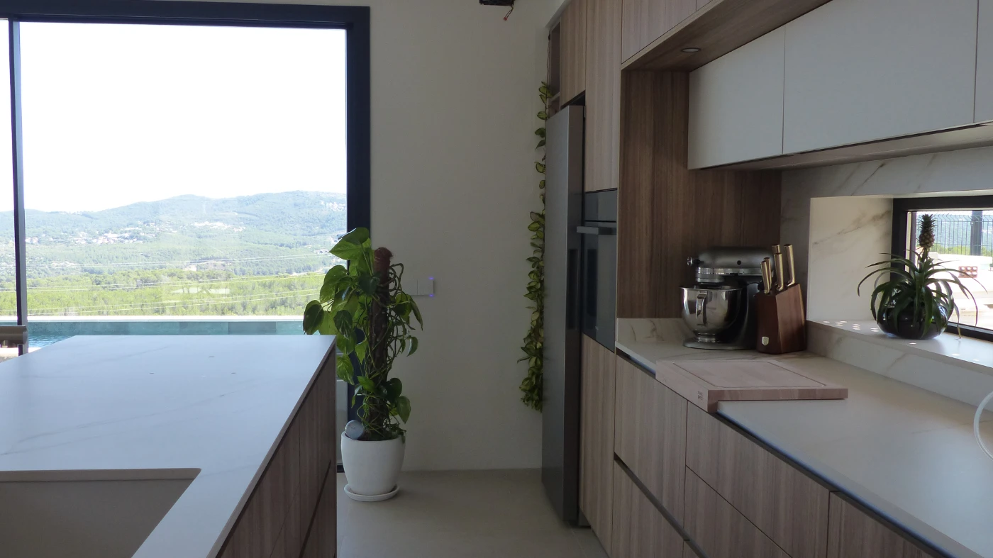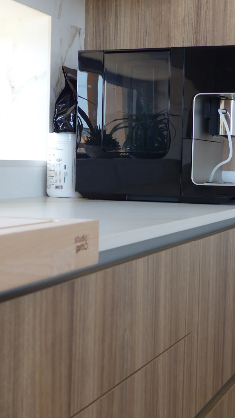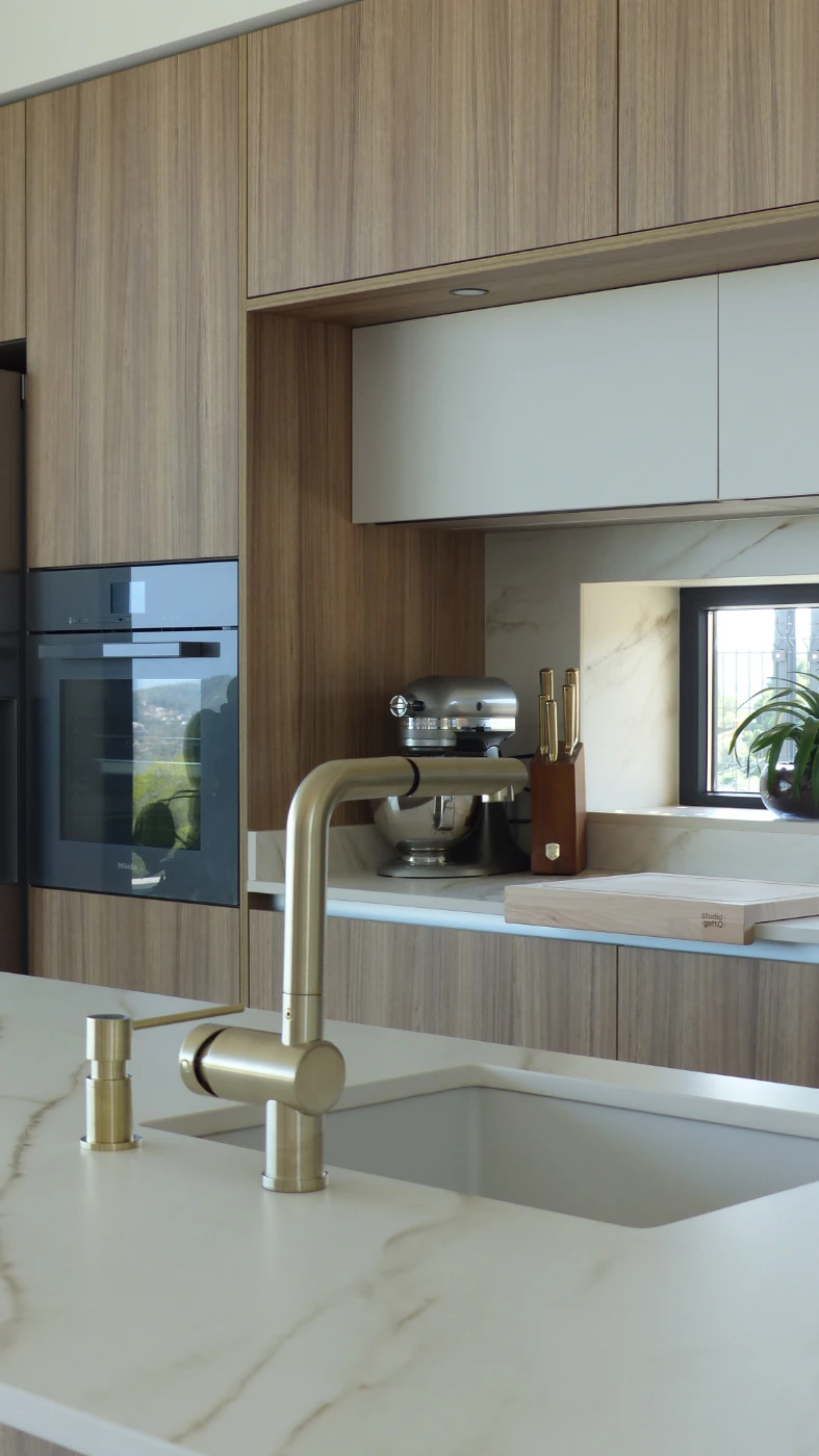El mobiliario elegido fue el modelo INKO Gourmet en los tonos Bercy y Boj, con sistema de apertura gola, que aporta una estética continua y depurada. La encimera Cooking Surface de inducción invisible en Calacatta Gold combina elegancia y tecnología, convirtiendo la cocina en un lugar donde diseño y funcionalidad se fusionan con naturalidad.