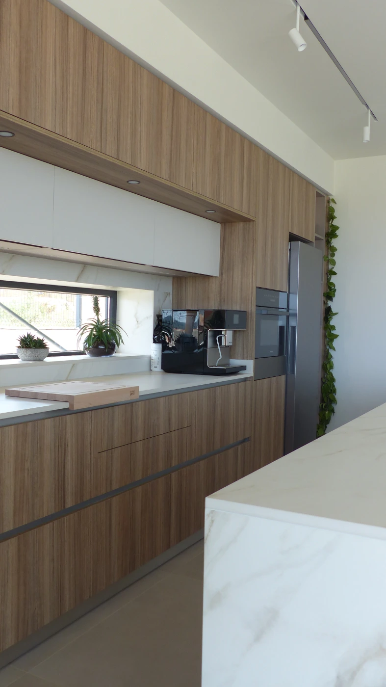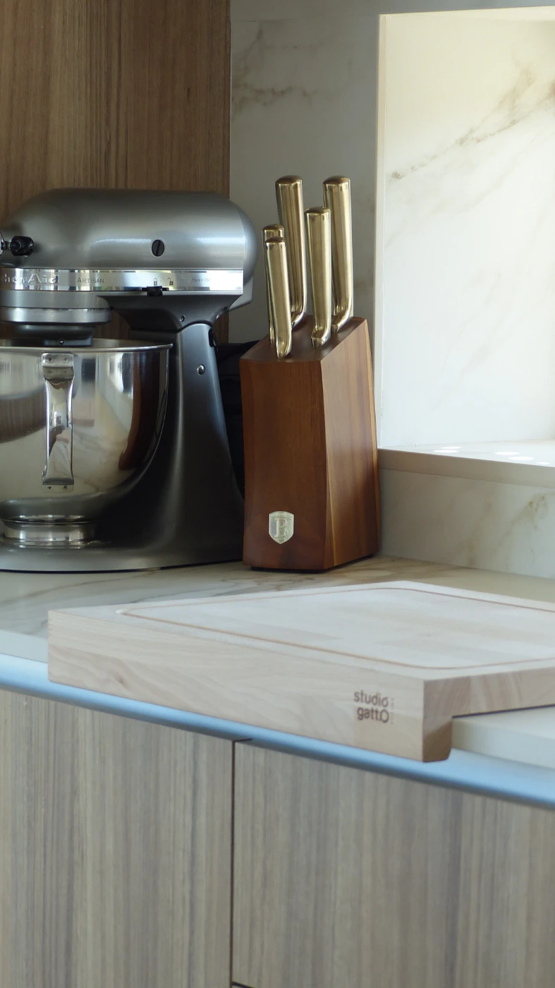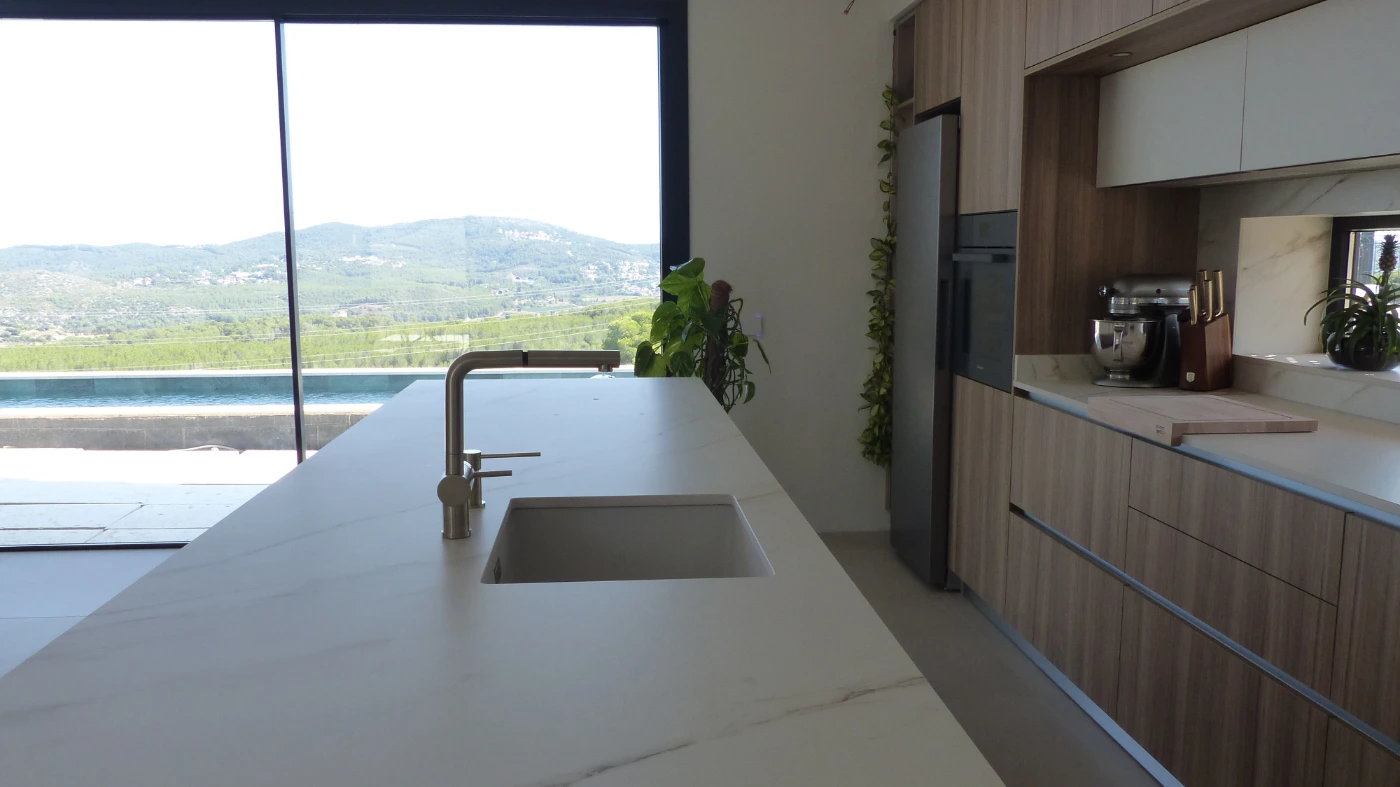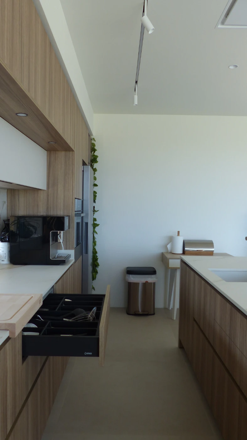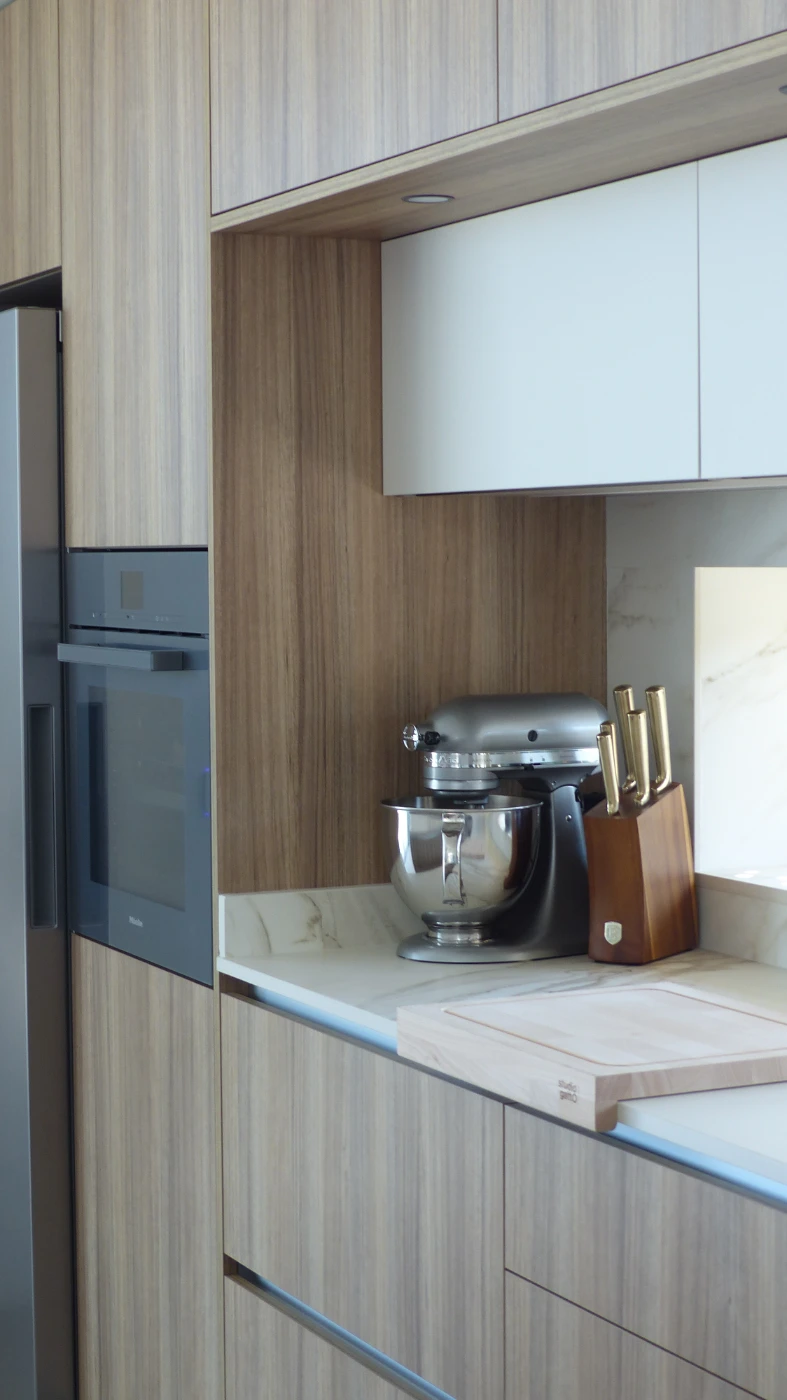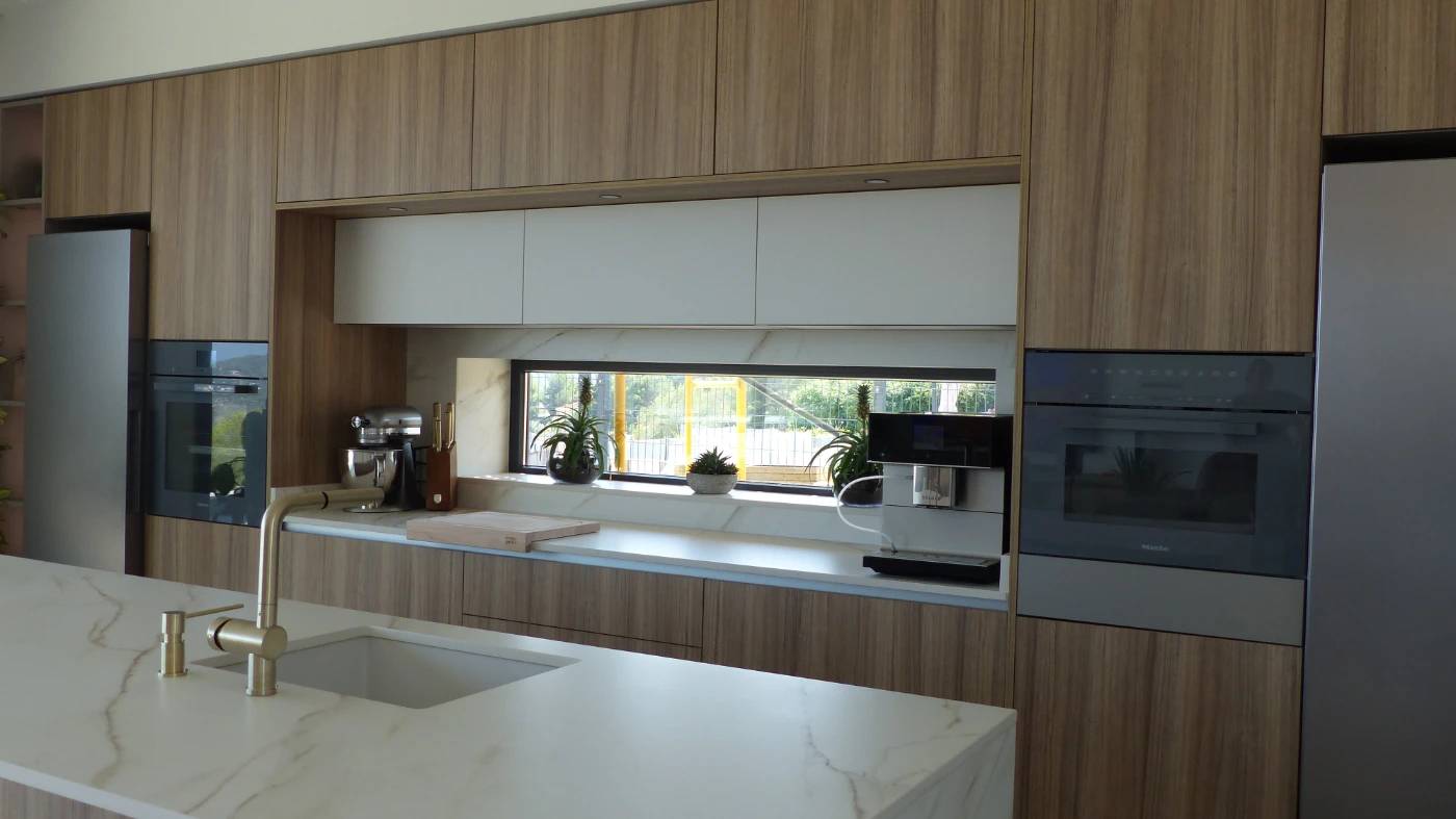 El mobiliario elegido fue el modelo INKO Gourmet en los tonos Bercy y Boj, con sistema de apertura gola, que aporta una estética continua y depurada. La encimera Cooking Surface de inducción invisible en Calacatta Gold combina elegancia y tecnología, convirtiendo la cocina en un lugar donde diseño y funcionalidad se fusionan con naturalidad.