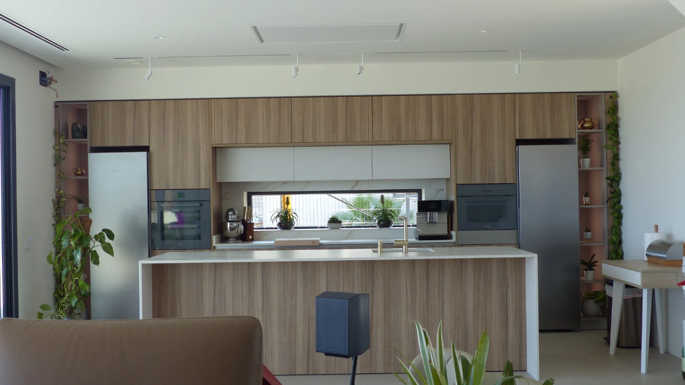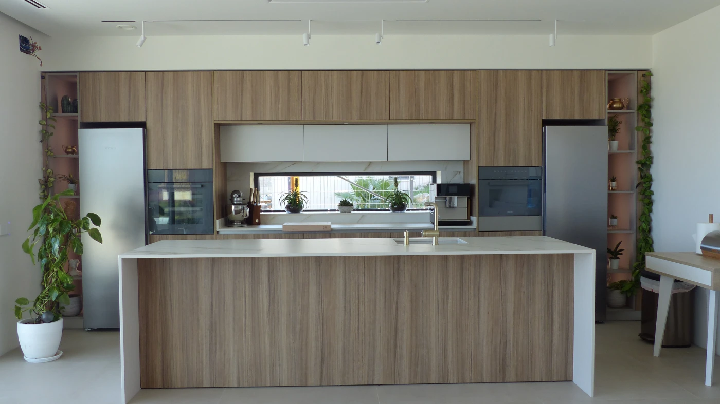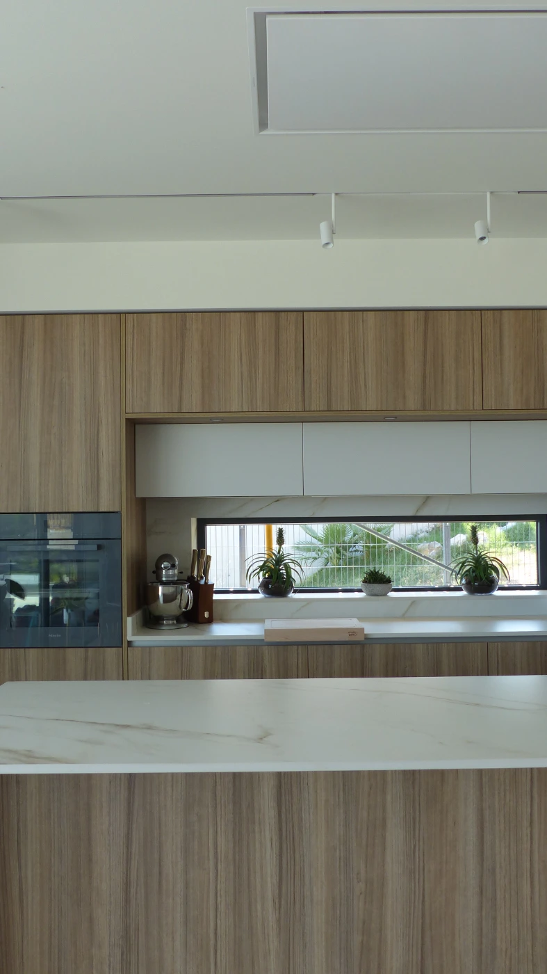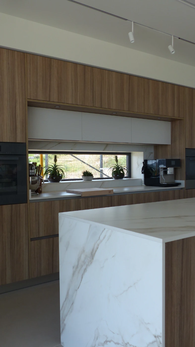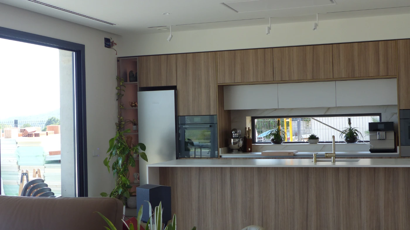 El mobiliario elegido fue el modelo INKO Gourmet en los tonos Bercy y Boj, con sistema de apertura gola, que aporta una estética continua y depurada. La encimera Cooking Surface de inducción invisible en Calacatta Gold combina elegancia y tecnología, convirtiendo la cocina en un lugar donde diseño y funcionalidad se fusionan con naturalidad.