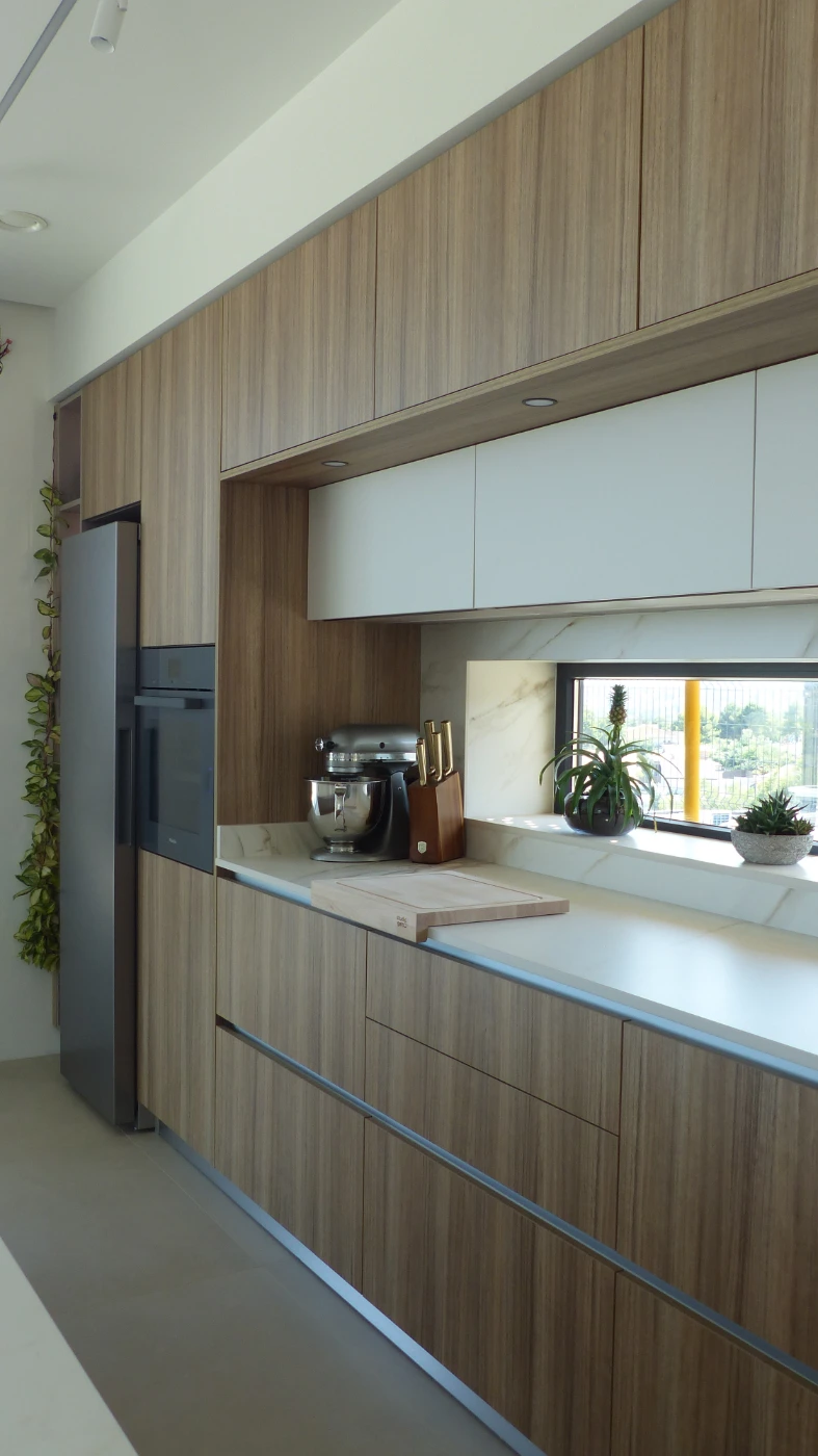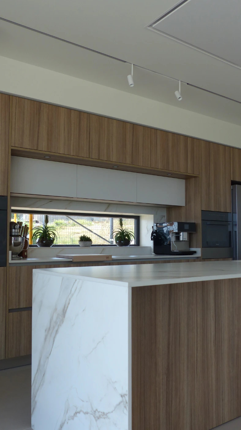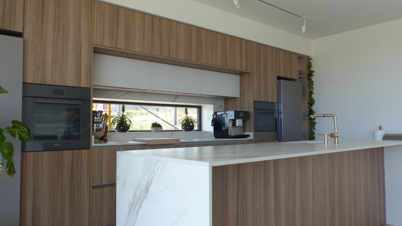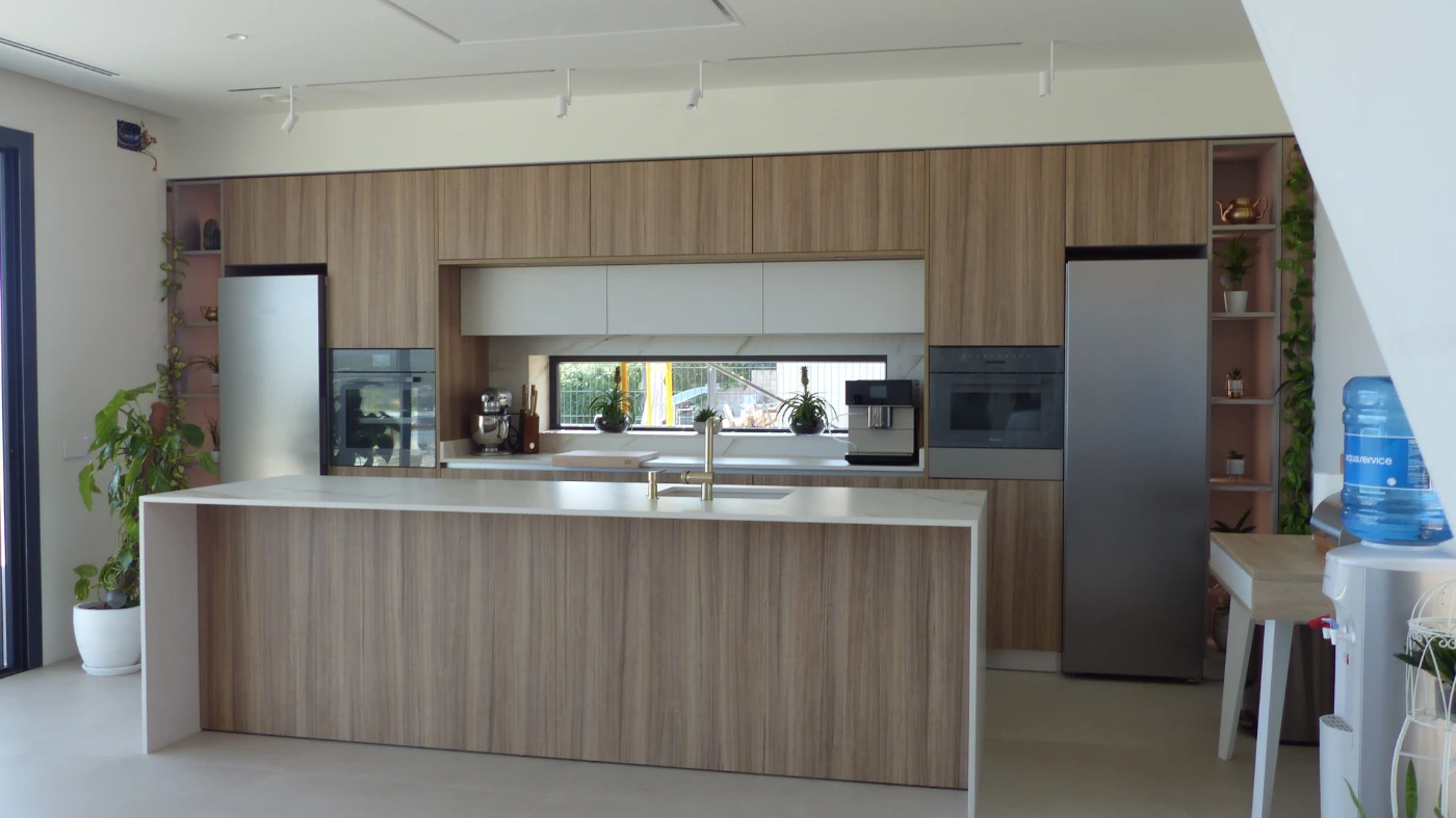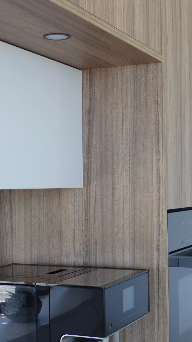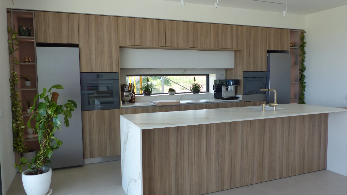 El mobiliario elegido fue el modelo INKO Gourmet en los tonos Bercy y Boj, con sistema de apertura gola, que aporta una estética continua y depurada. La encimera Cooking Surface de inducción invisible en Calacatta Gold combina elegancia y tecnología, convirtiendo la cocina en un lugar donde diseño y funcionalidad se fusionan con naturalidad.