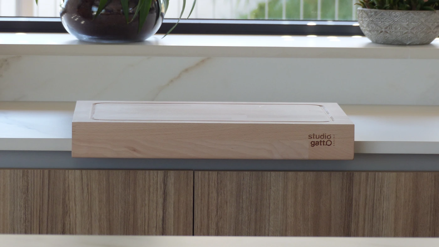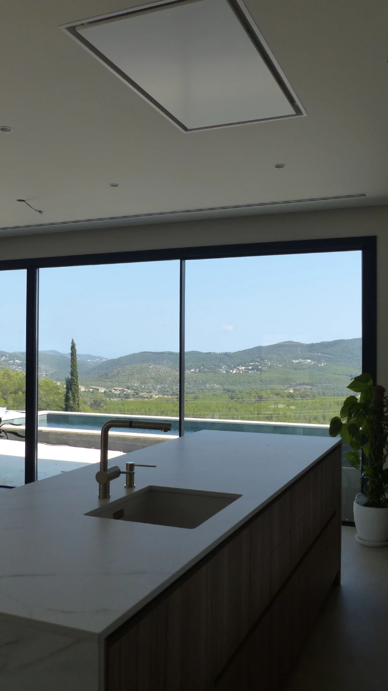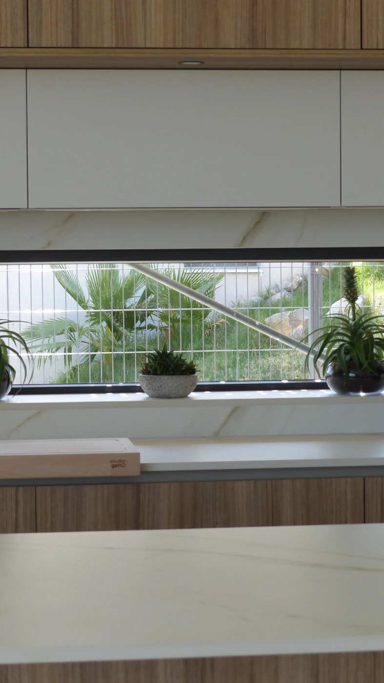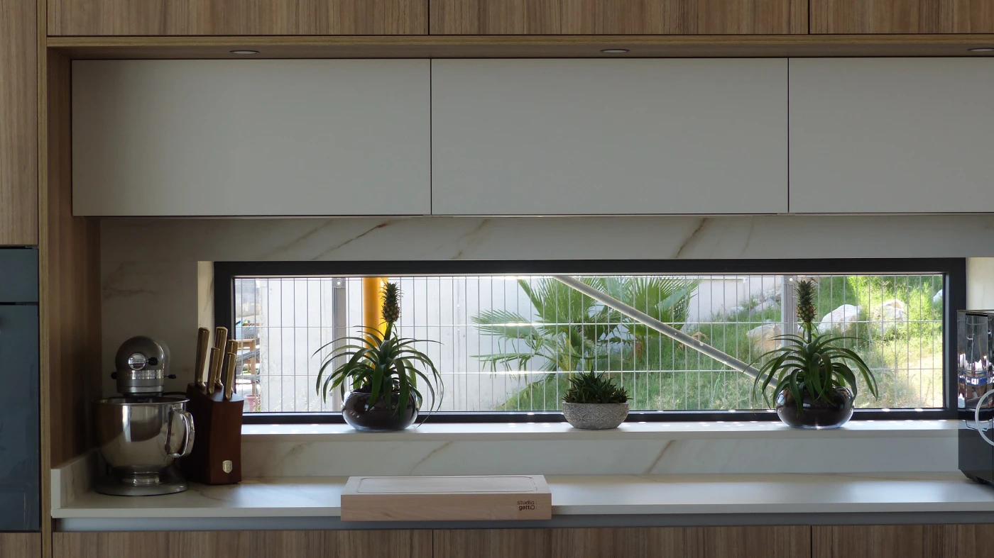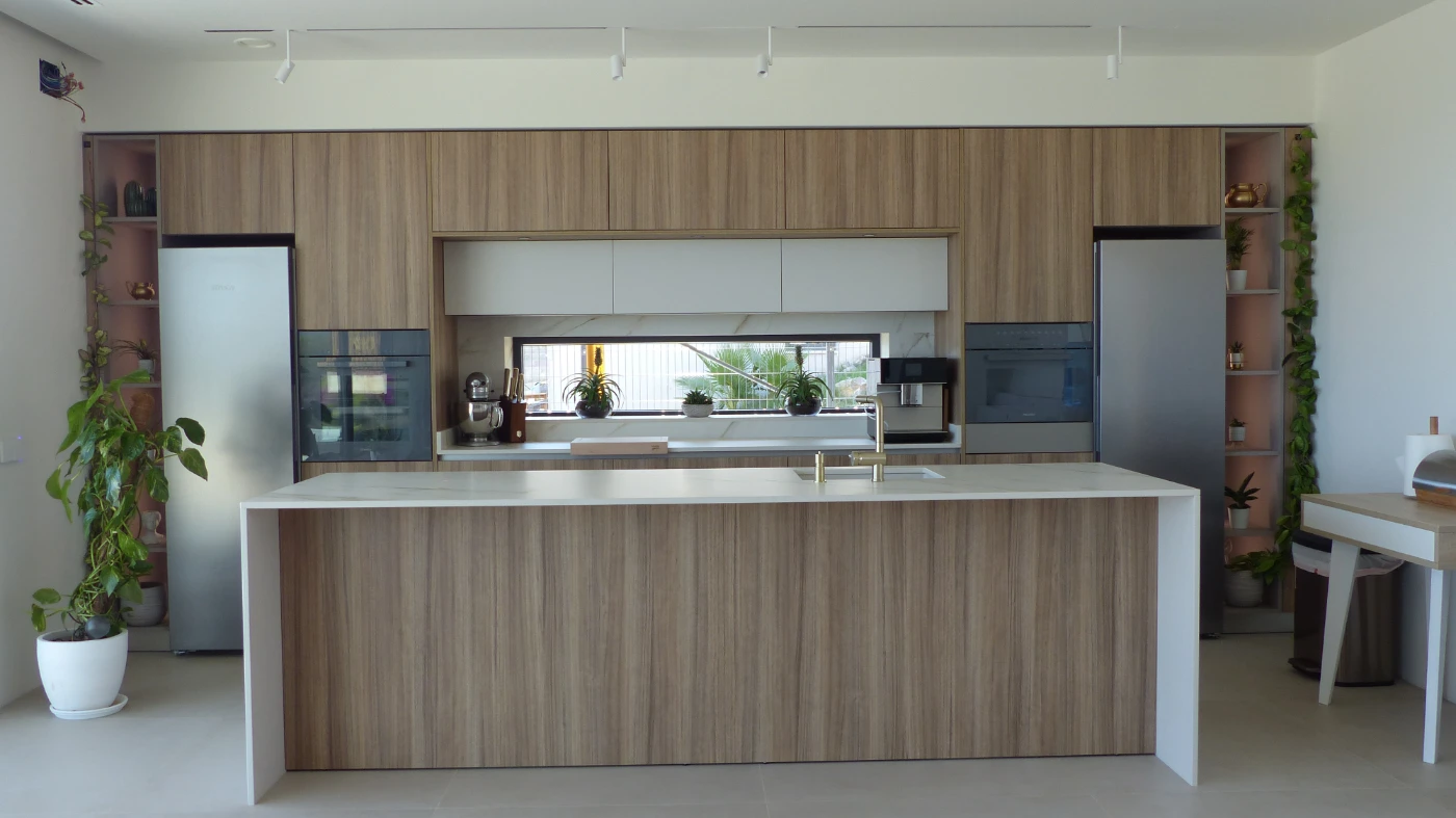 El mobiliario elegido fue el modelo INKO Gourmet en los tonos Bercy y Boj, con sistema de apertura gola, que aporta una estética continua y depurada. La encimera Cooking Surface de inducción invisible en Calacatta Gold combina elegancia y tecnología, convirtiendo la cocina en un lugar donde diseño y funcionalidad se fusionan con naturalidad.